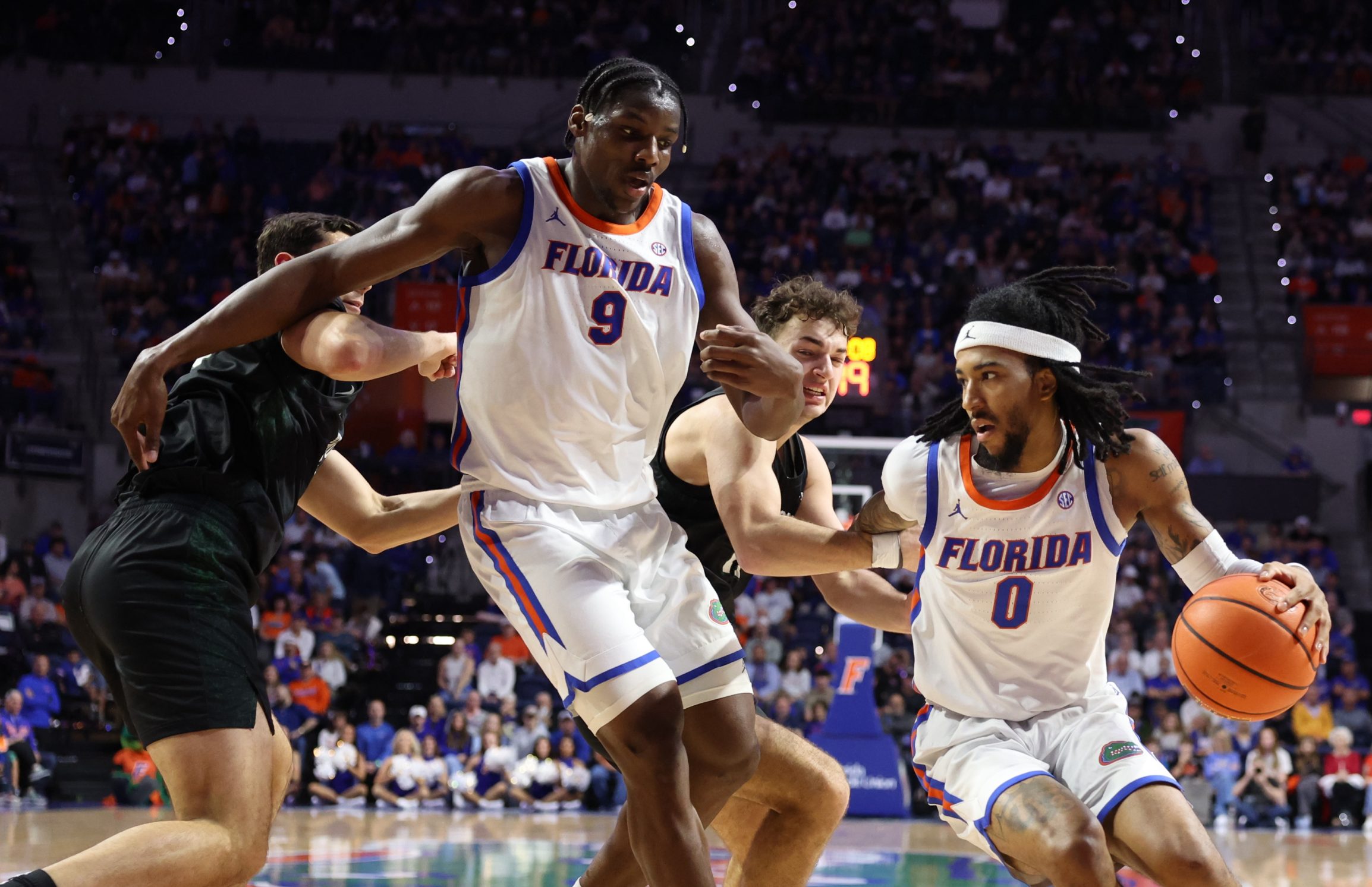 Center Micah Handlogten scored on a layup and off of an offensive rebound as he figured inside of a 15-6 run where five Gators scored to up the lead to 45-20 with 4:26 left until halftime. Guard Xaivian Lee converted a pair of layups in the halfcourt as the Gators extended to a 53-27 advantage at the break.